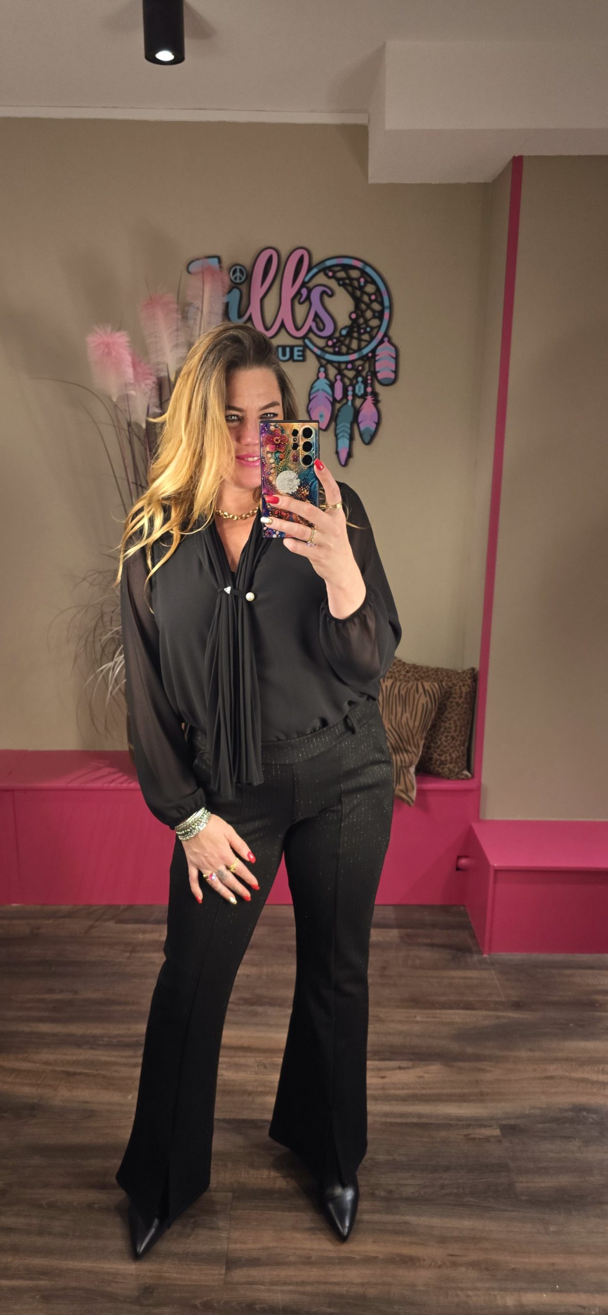 Wauw deze blouse heeft een soort van sjaal ketting met een parel als broche, heel mooi.