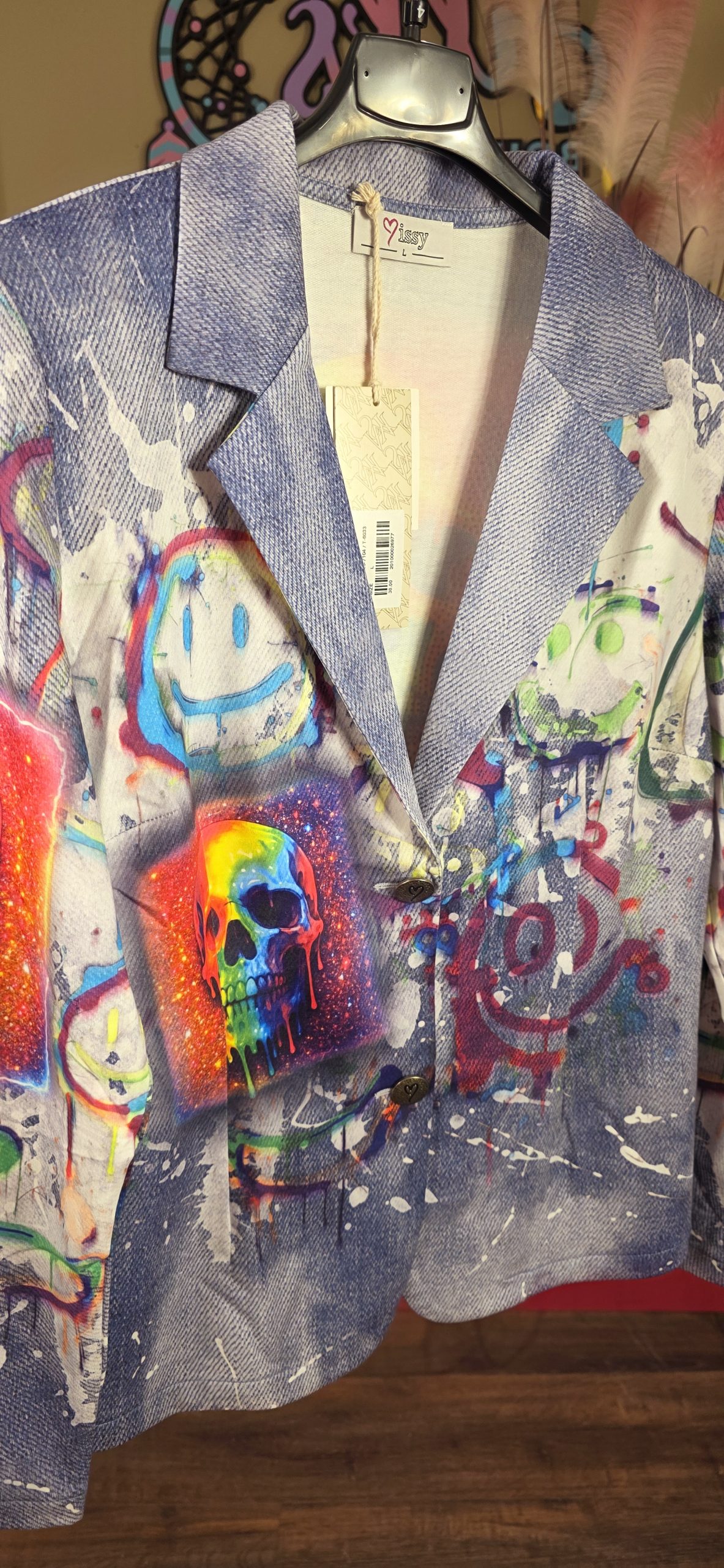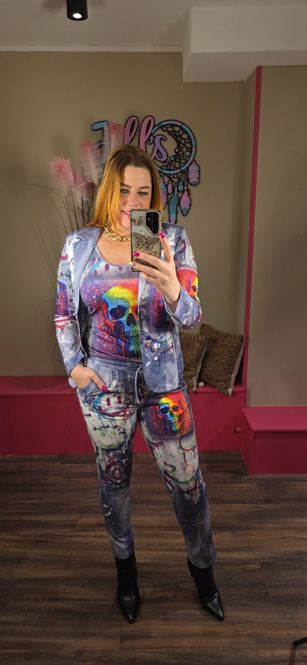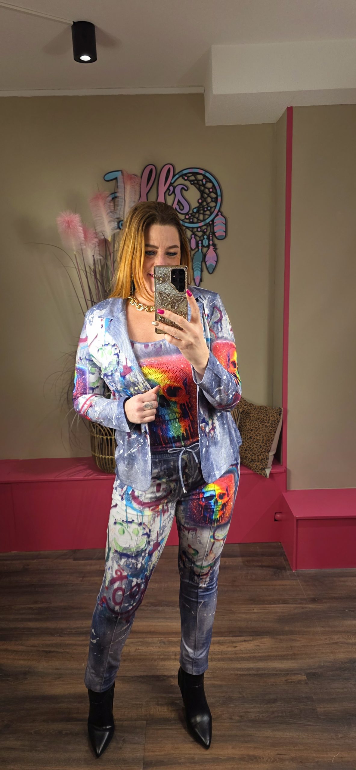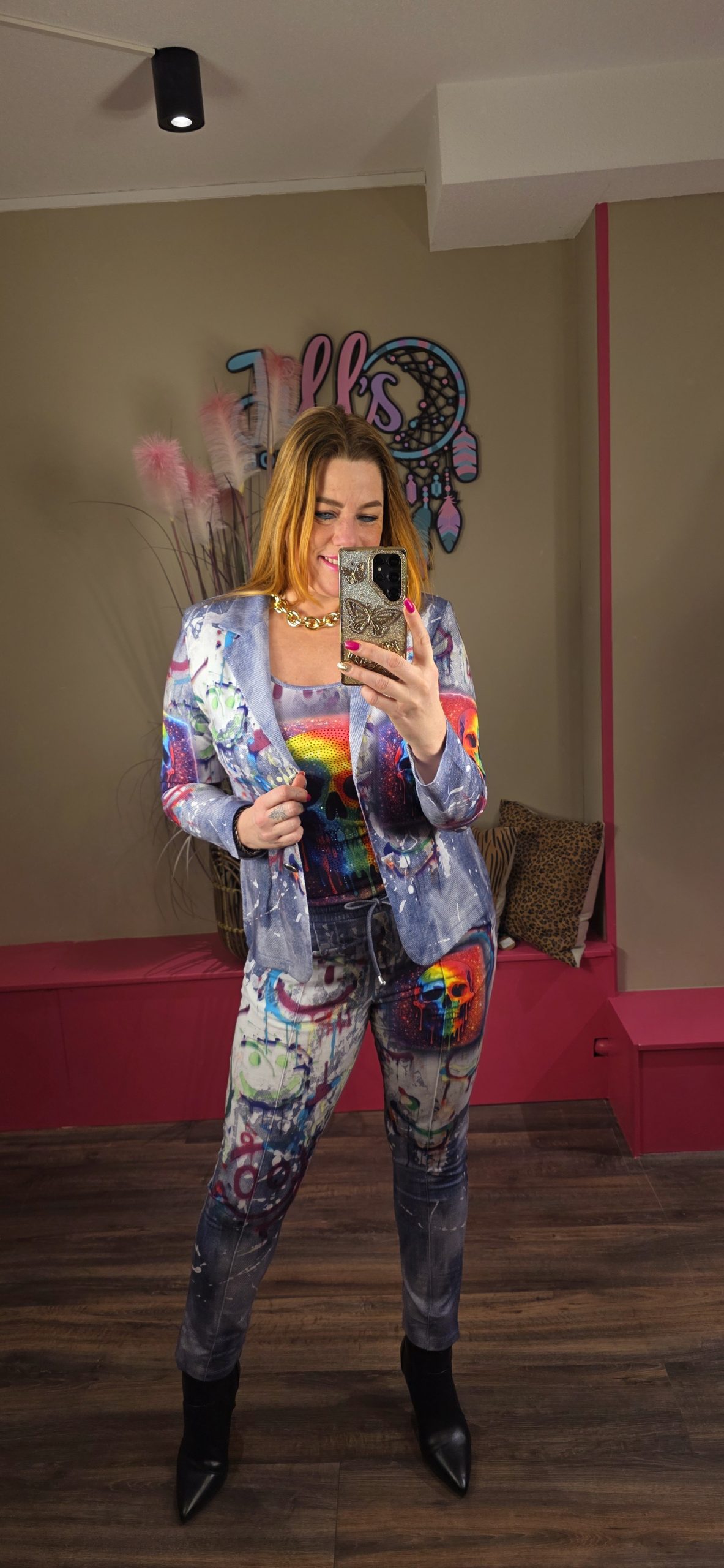 De blazers vallen in dubbele maten. Jill heeft van boven maat 40/42 en draagt hier maat L.