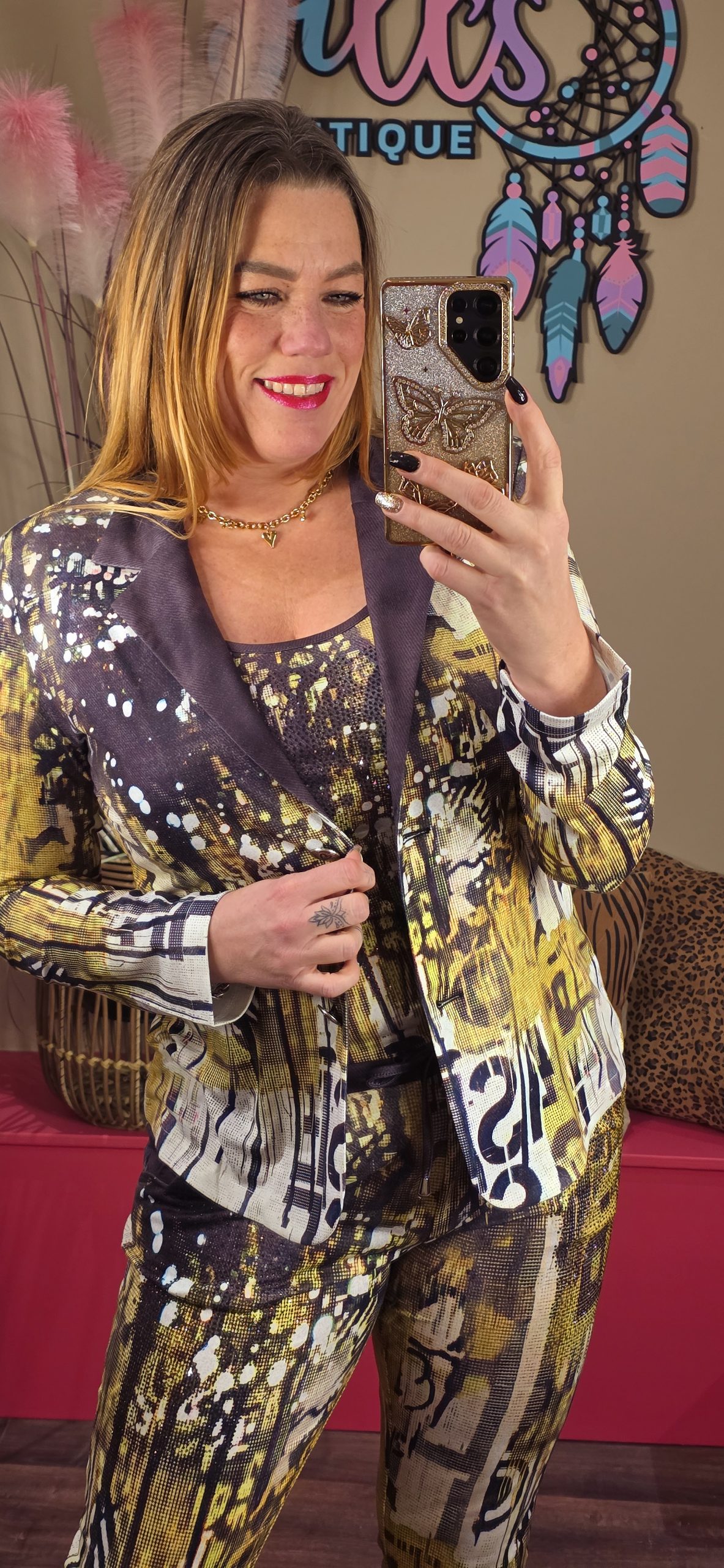 De blazers vallen in dubbele maten. Jill heeft van boven maat 40/42 en draagt hier maat L.