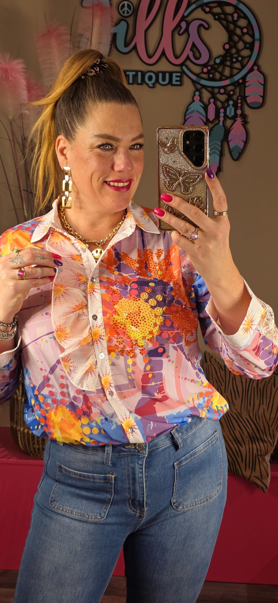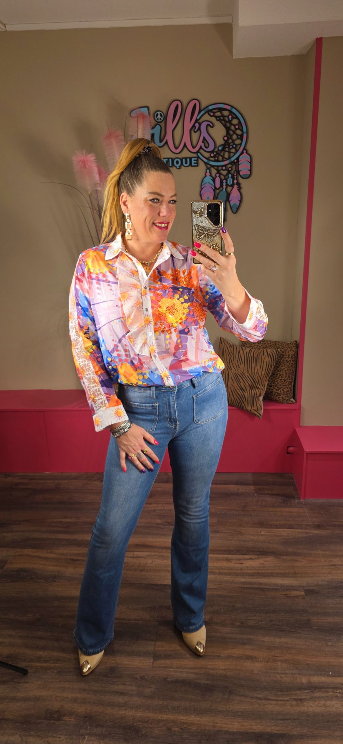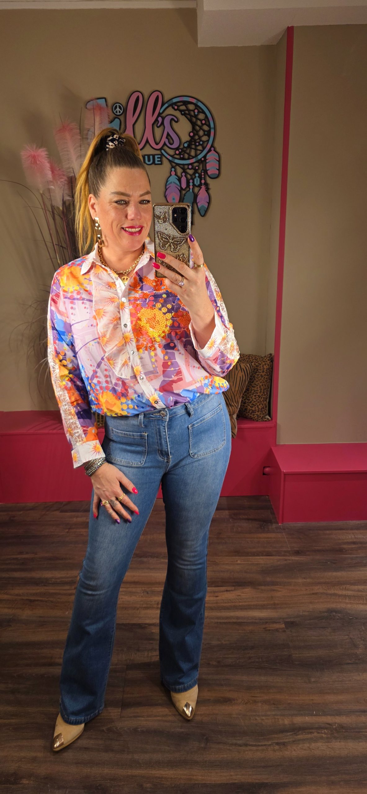 De blouses vallen vrij ruim, Jill heeft maat 40/42 en draagt hier maat L.