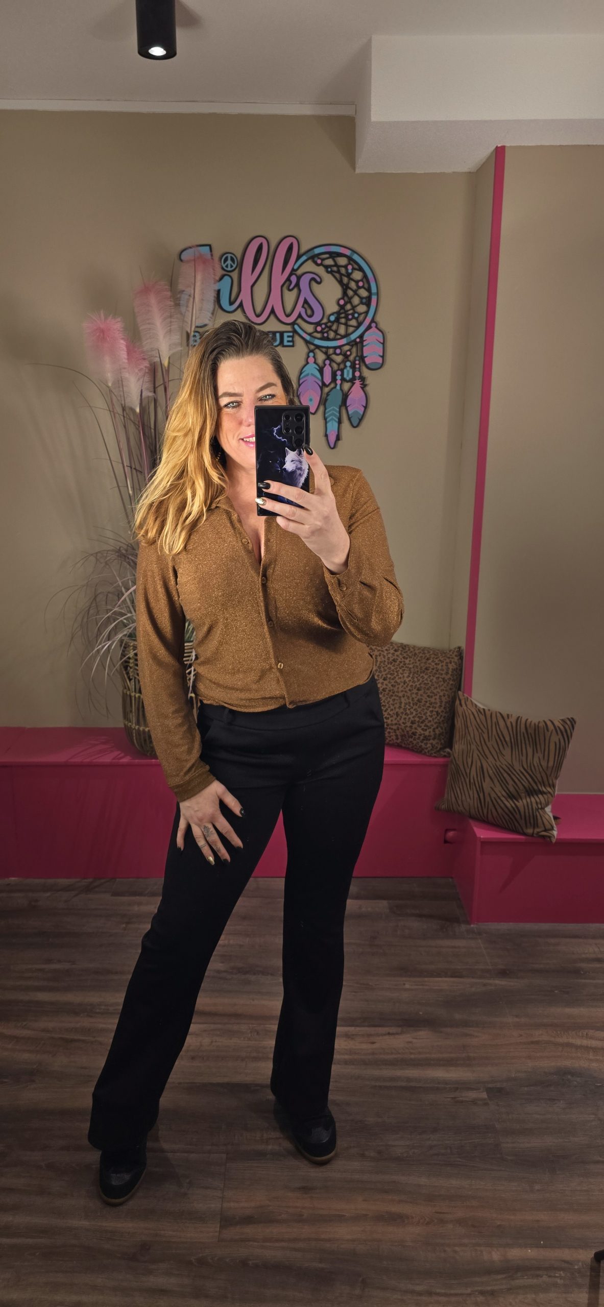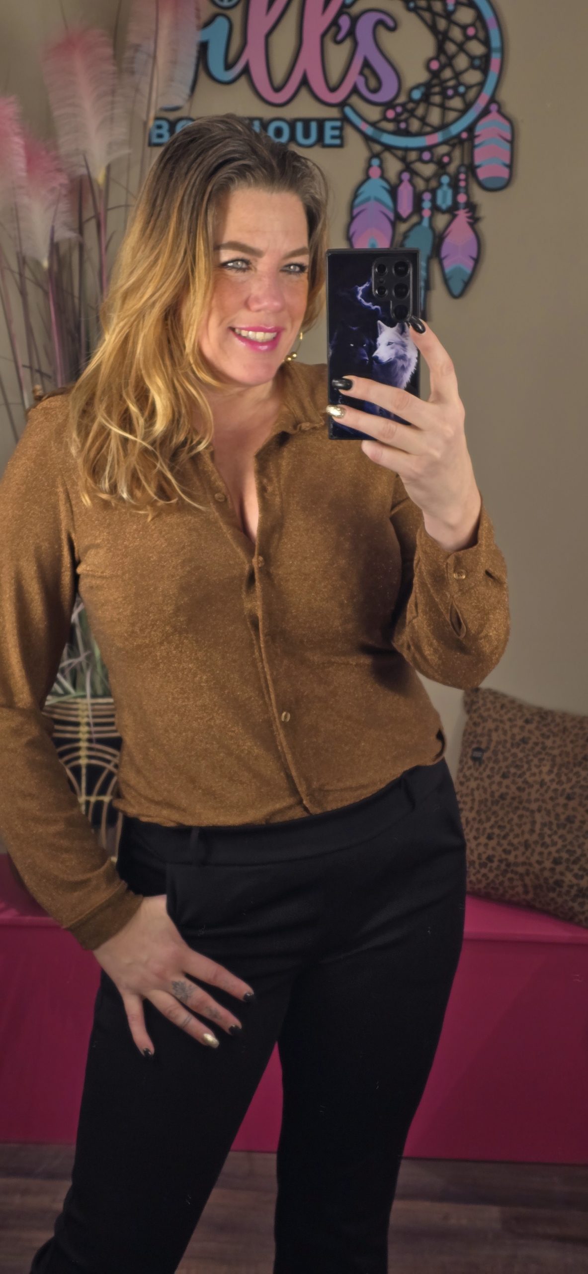 De blouses vallen wat ruimer uit, Jill heeft L/XL en draagt hier maat L.