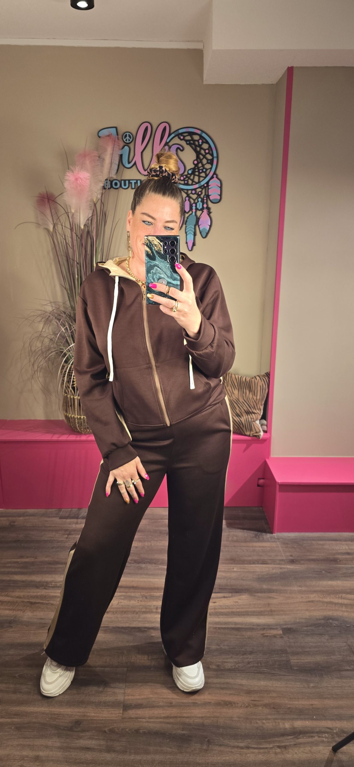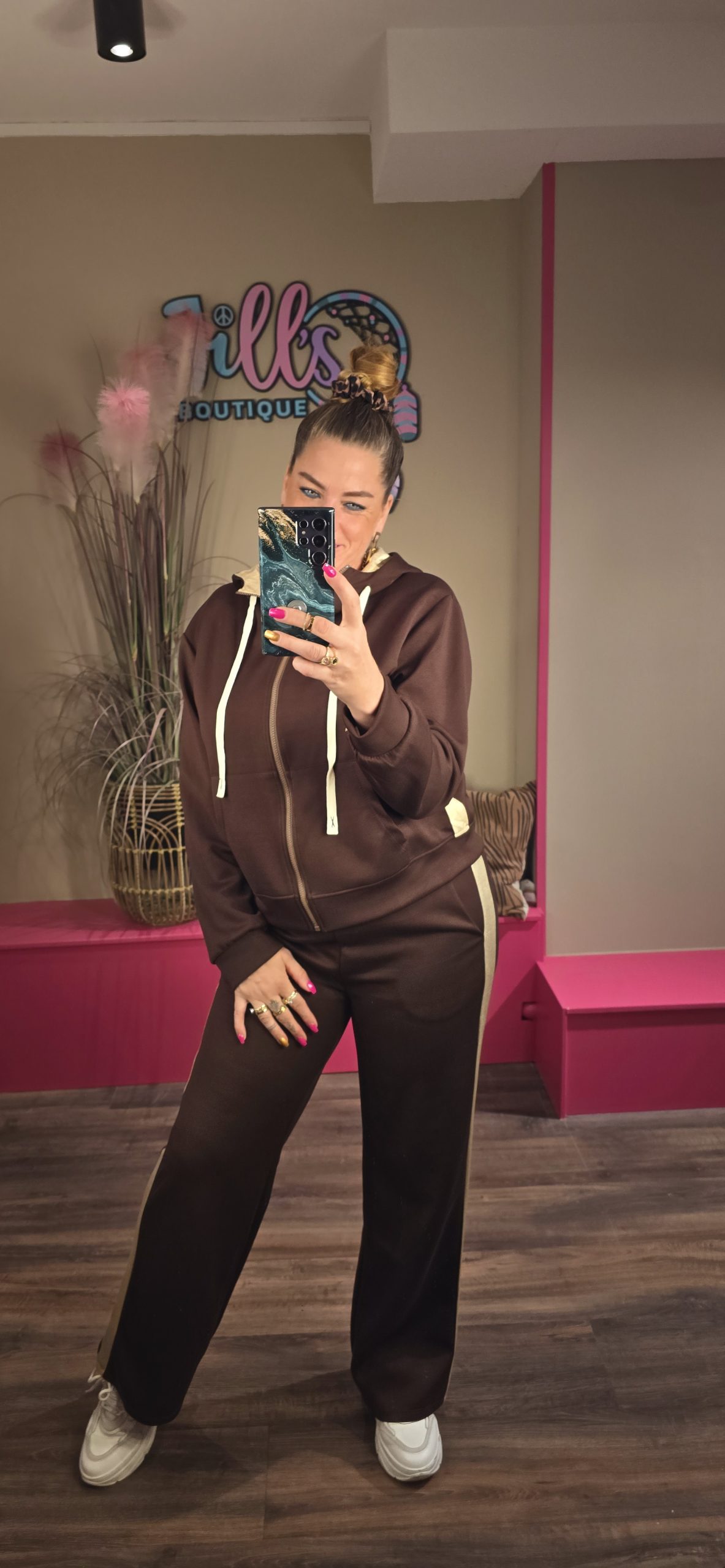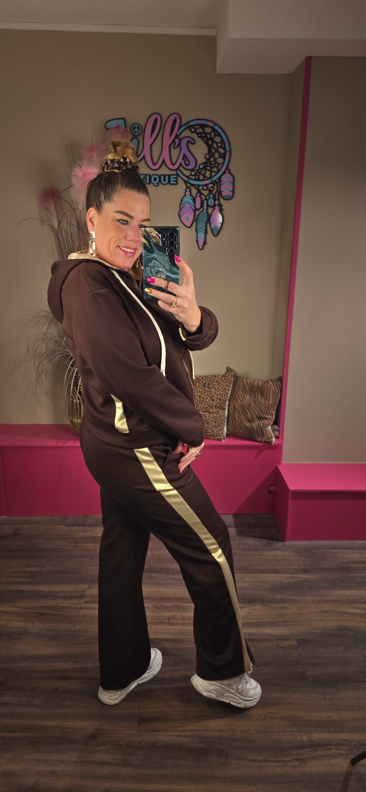 Heerlijk zacht tweededelig pak, het pak komt met de broek en een jas/vestje. De pakken hebben een metallic bies aan de zijkant en een metallic capuchon.