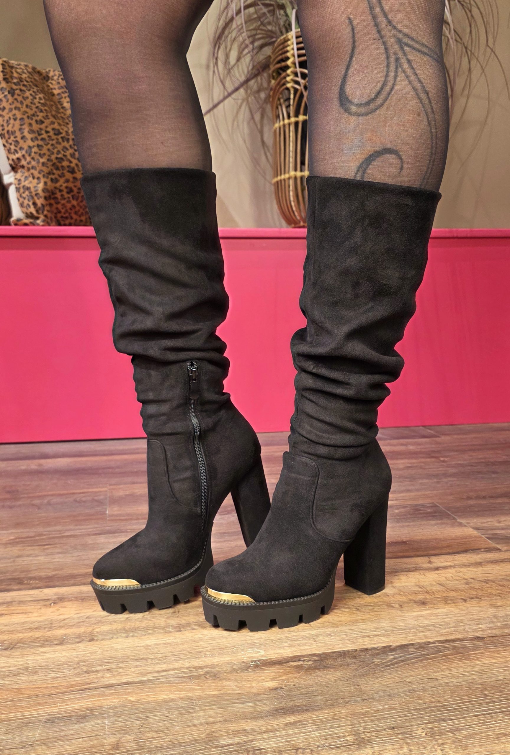Gave hoge laarzen met een mooi gouden detail op de neus van de laars.