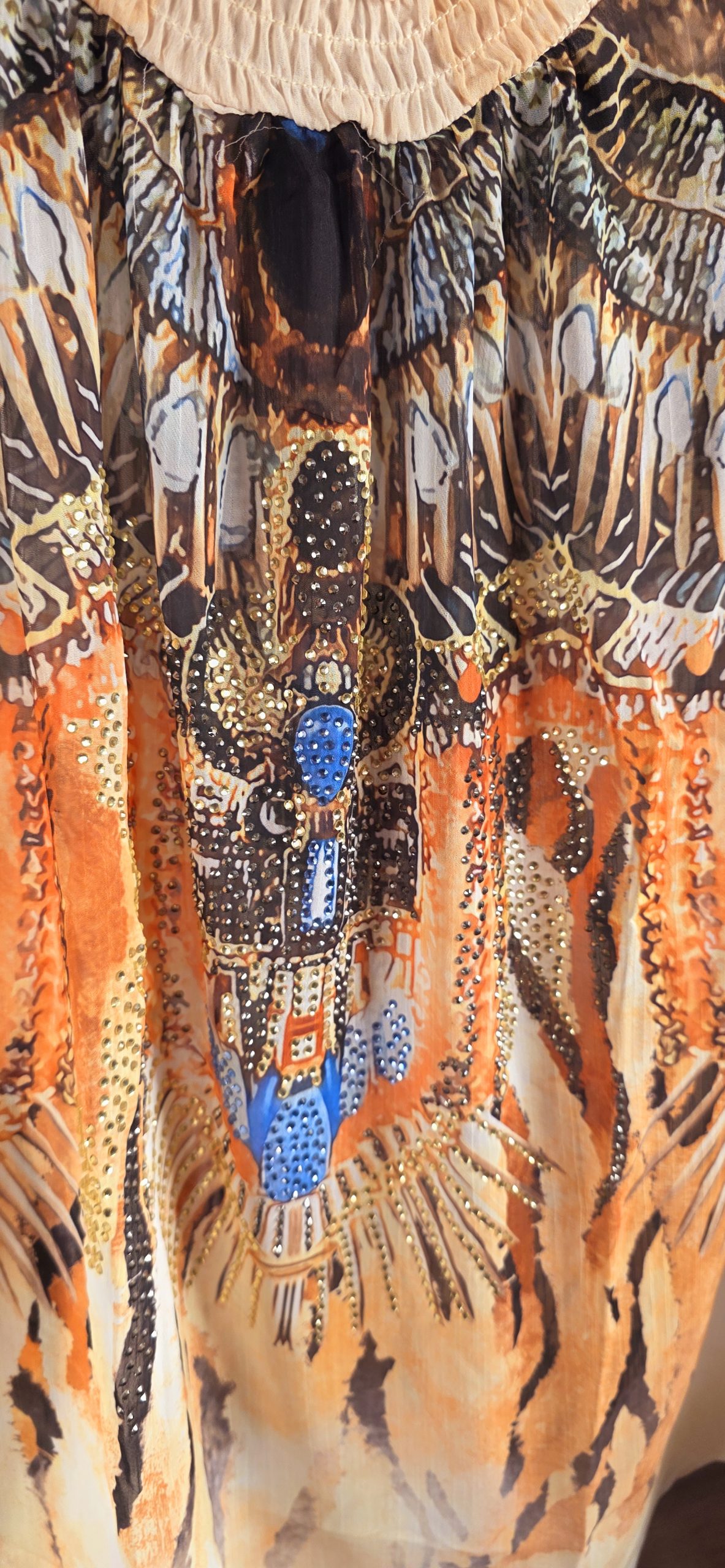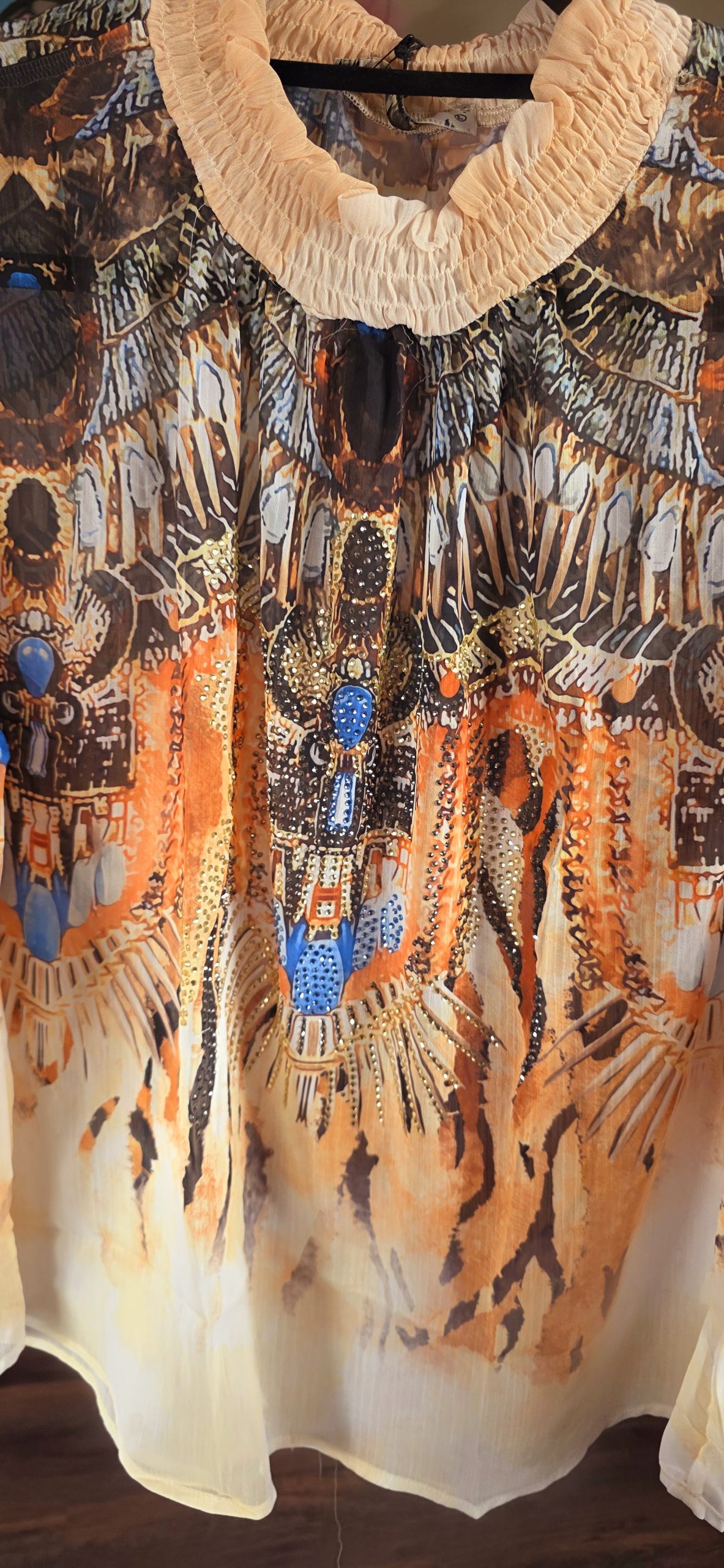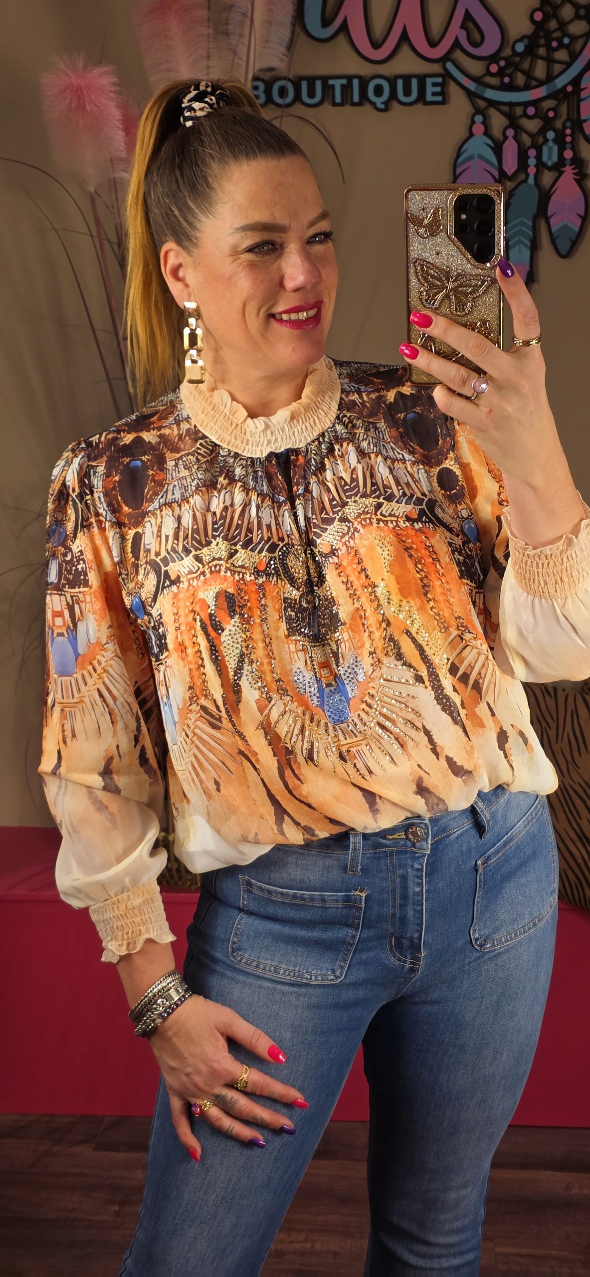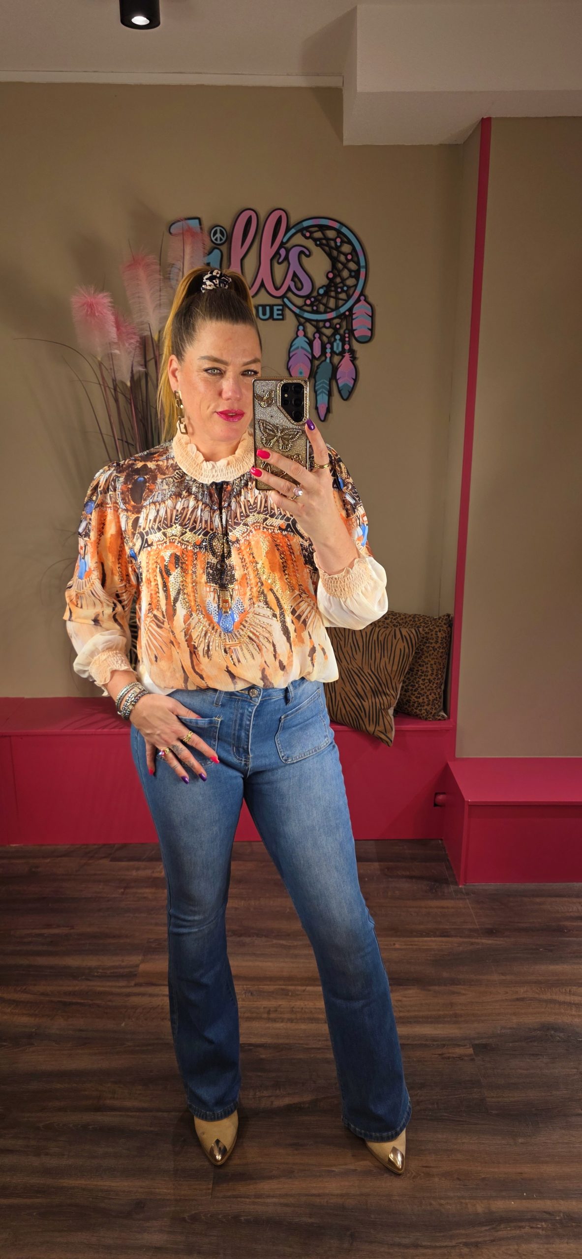 Mooie blouse met een gave bewerking op het voorpand. De tops vallen niet strak aan de nek.