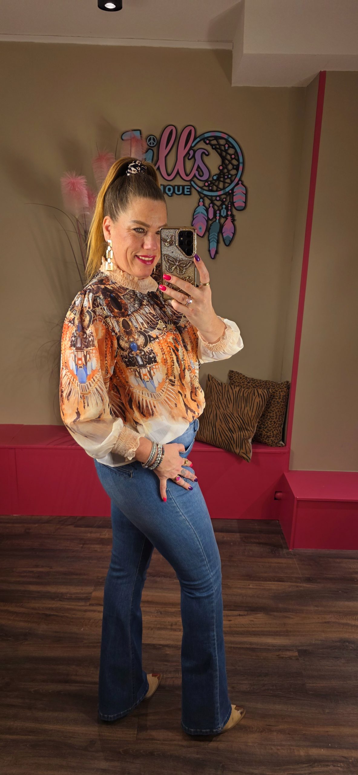 De blouses vallen vrij ruim, Jill heeft maat 40/42 en draagt hier maat L.