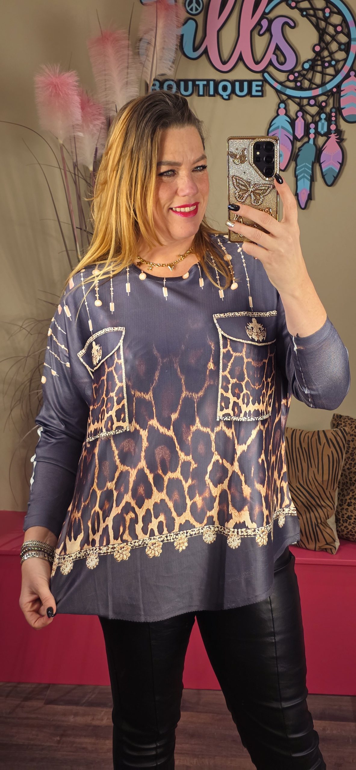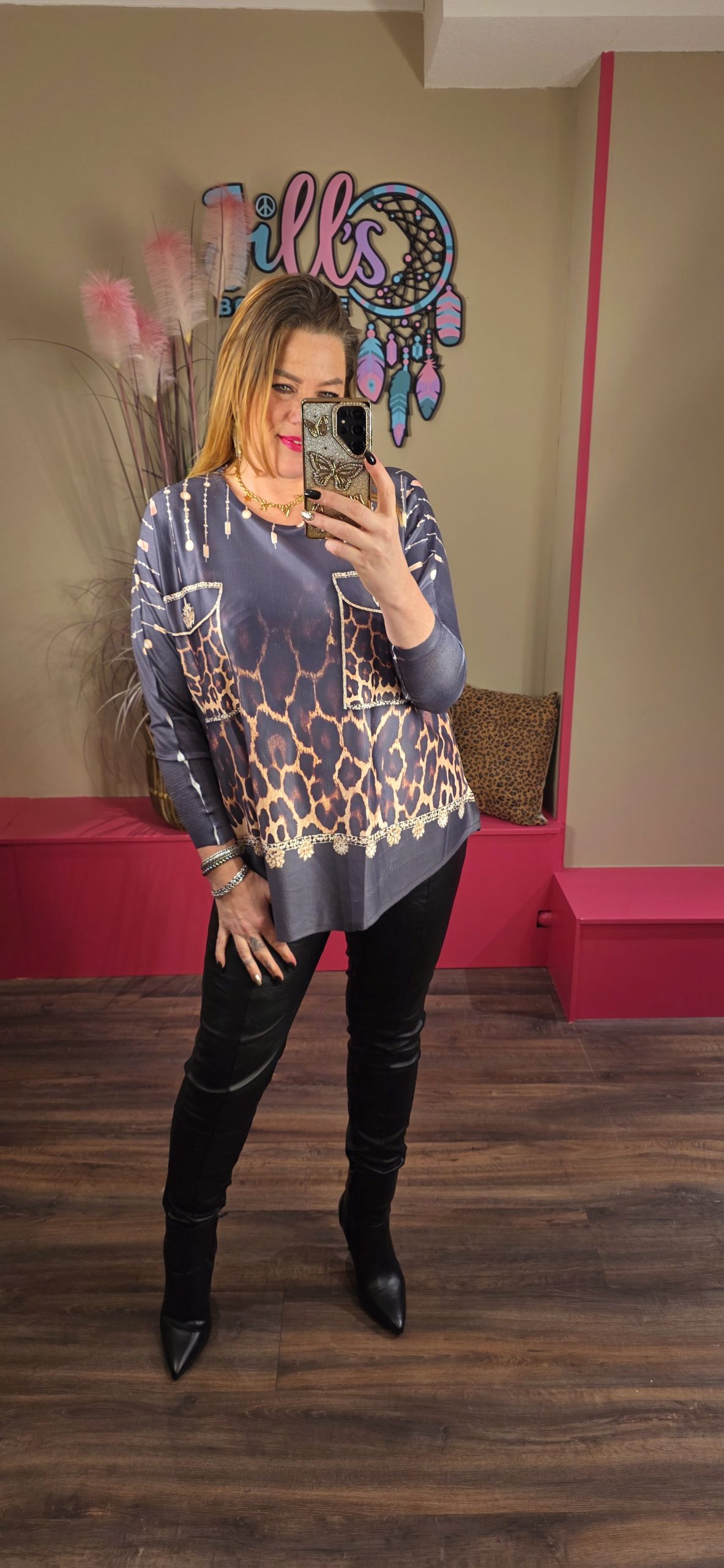 Zachte dunne top leuk met een gilet eroverheen.