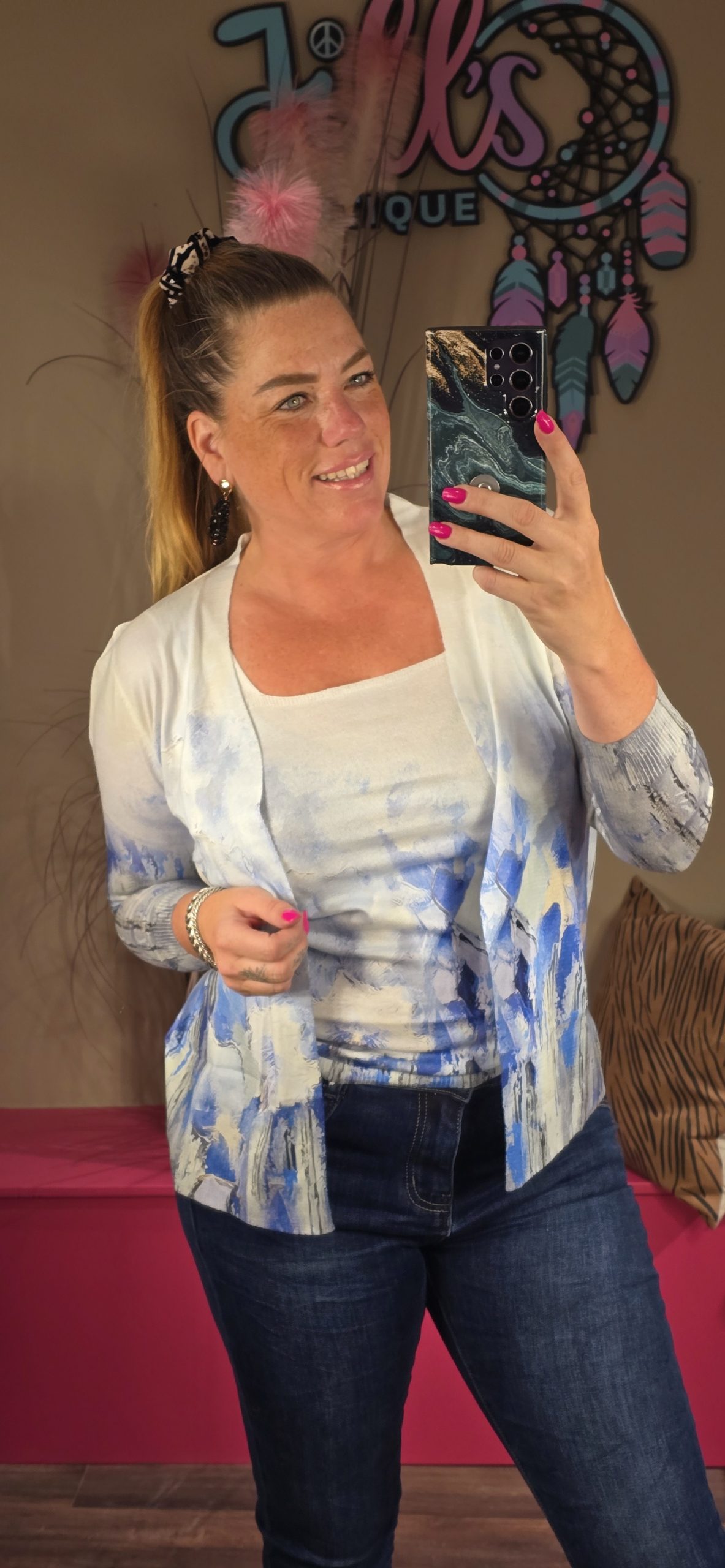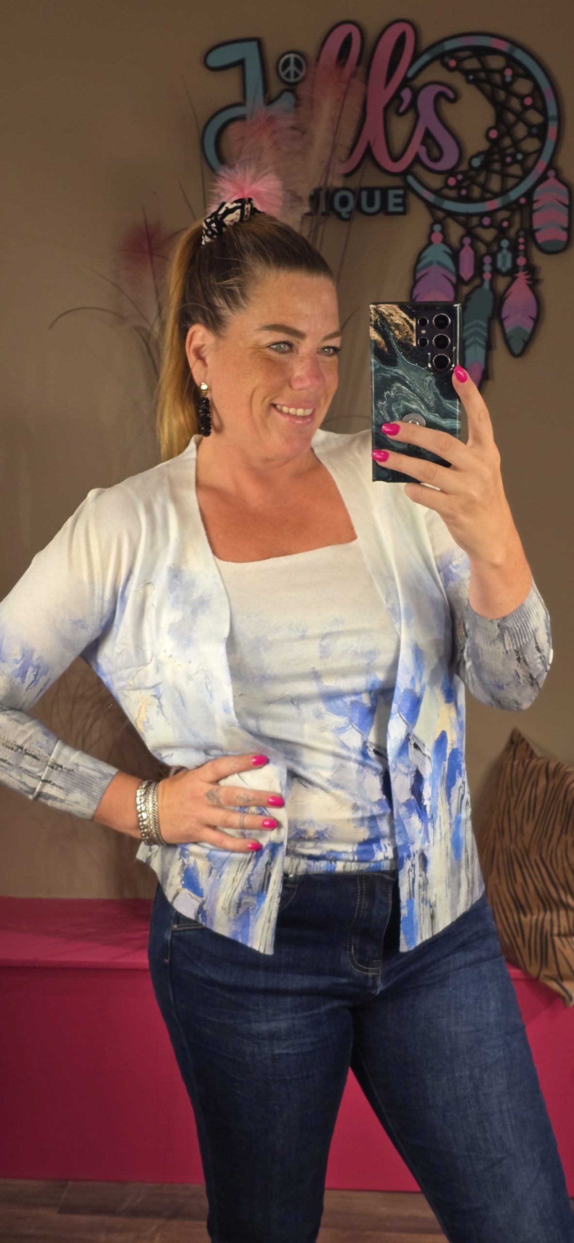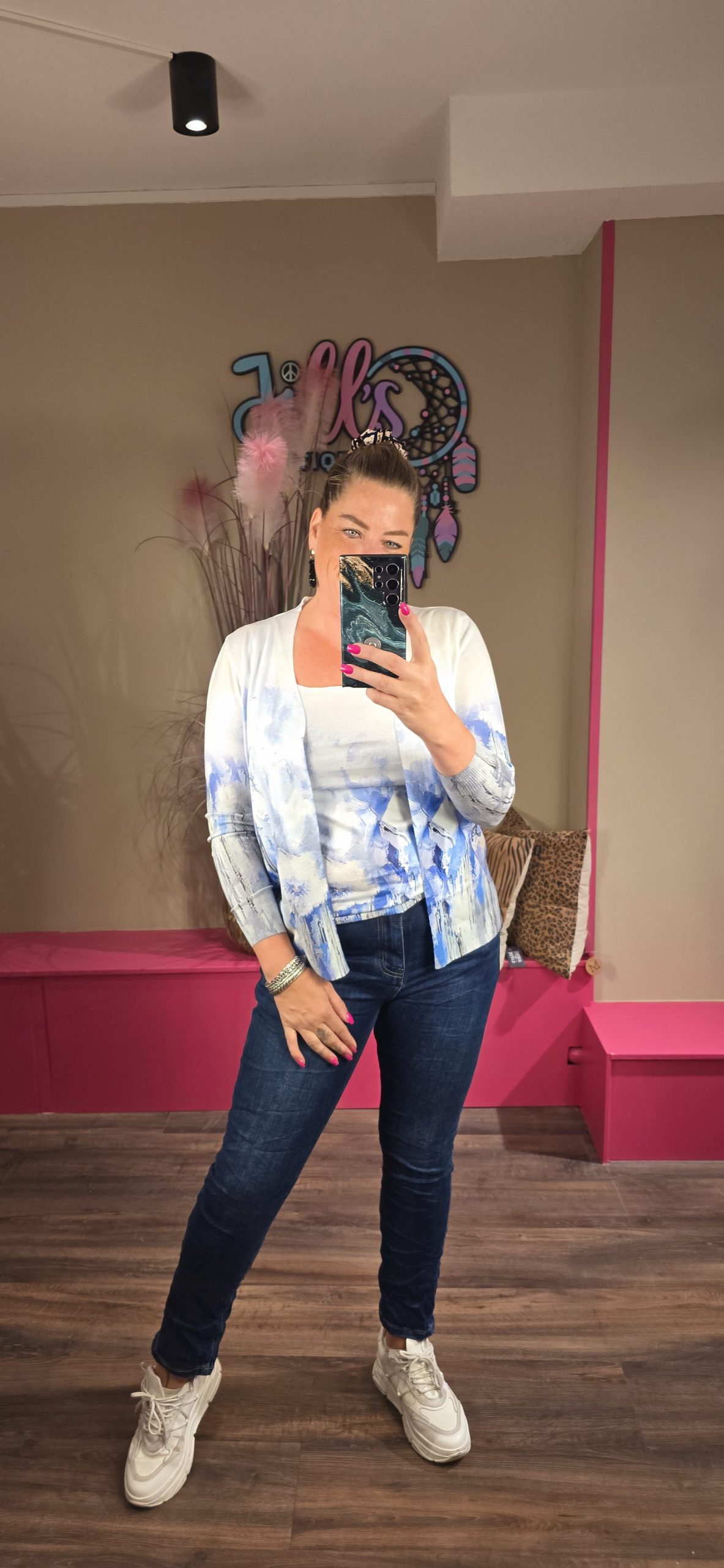 Jill heeft maat 40/42 en draagt hier maat M/L, hij zit wel echt aansluitend wil je hem iets losser dragen bestel dan een maatje groter.
